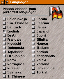 The Language window opens from game options and the new game window.