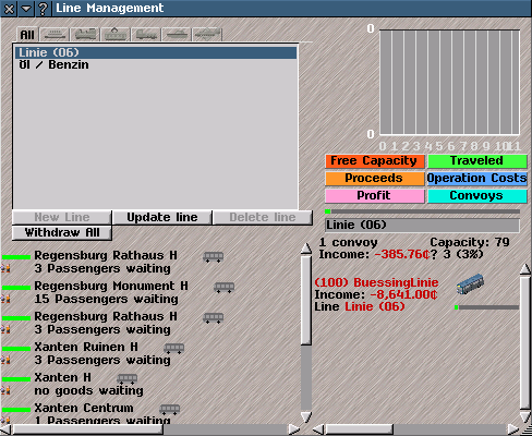 At the top of the list of vehicles, the total number of convoys assigned to line, profit (proceeds less running costs), capacity, and current quantity of goods and passengers carried (% of full capacity in brackets) of all convoys on line is shown. If the percentage is greater than 100%, the line is overcrowded.