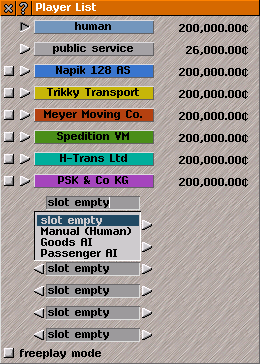 Each empty slot has allows a selection between human or AI players (and different types of AI players). AI players are those controlled by the computer: they will build transport networks in competition with yours automatically. By switching to an AI player, you can take over the running of an AI transport network.