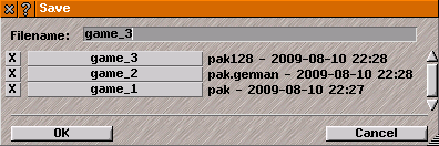 WARNING: Click x-button by filename to DELETE game immediately and permanently, the filename is removed from list and Save closes. Use this function carefully.